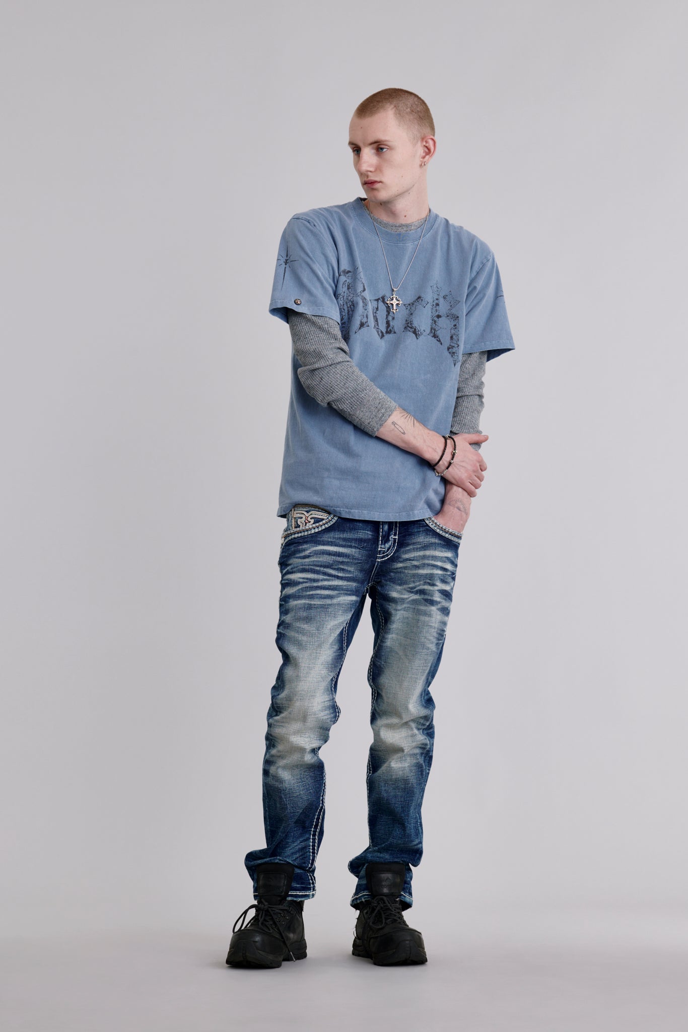 【Roma 】RANCLIC side slit denim ribbon Ermias Straight Jeans | Medium Wash | Rock Revival