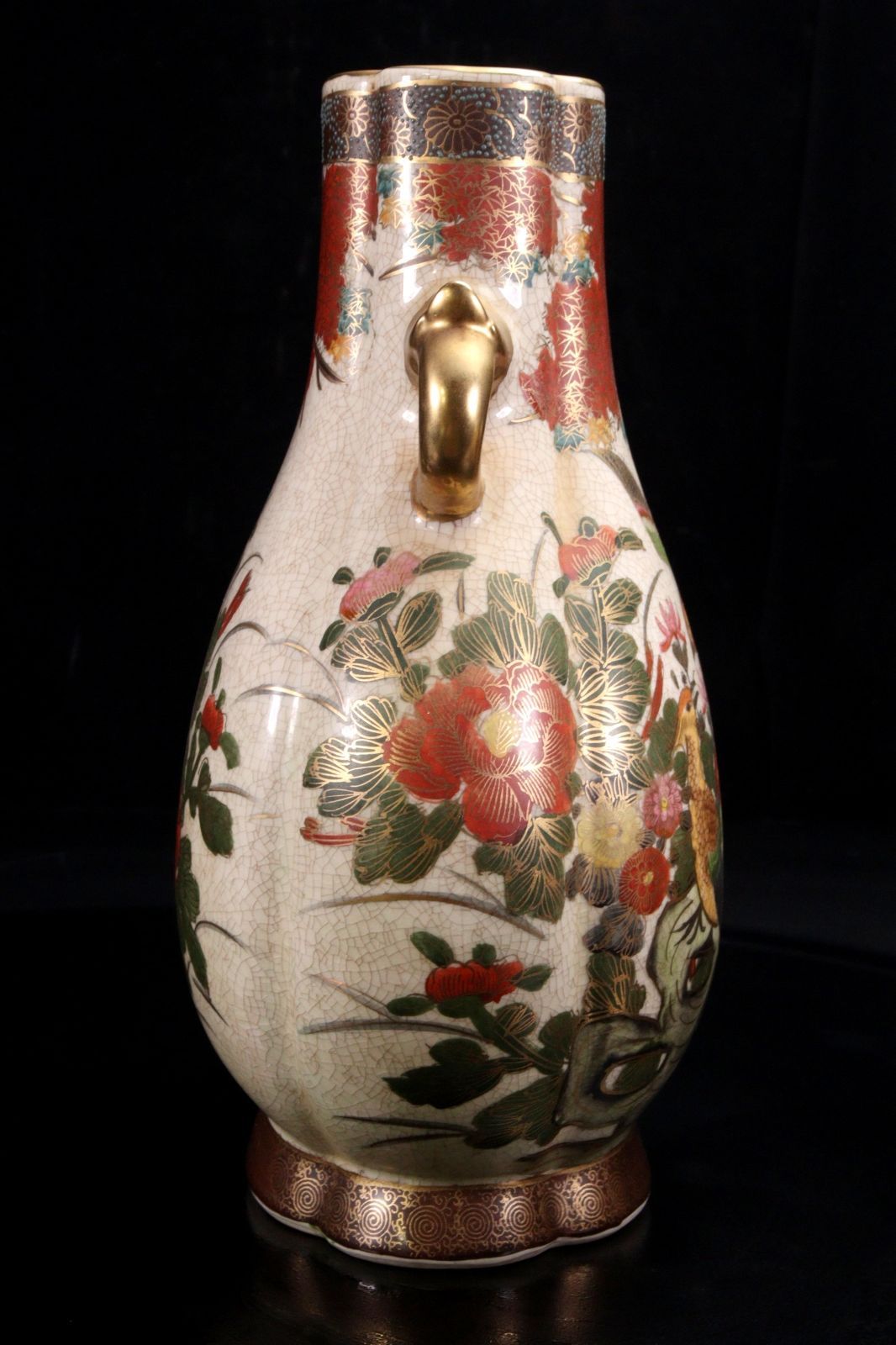 - 美術品・アンティーク・コレクション > 工芸品 > 薩摩焼 大型 双耳花瓶 飾壺 獅子耳 花柄 金彩 両耳付 花瓶 フラワーベース 薩摩焼 壺 花瓶 双耳 金襴手 色絵 花入 人物 武者 歌人 銘 里帰り