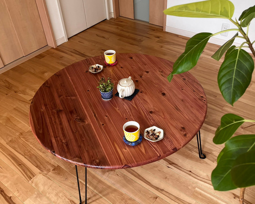 - 机・テーブル > センターテーブル・ローテーブル > 杉無垢材の折りたたみテーブル【ハンドメイド家具】 角・側面丸面加工 つい触りたくなる国産杉の折り畳みちゃぶ台】直径90㎝ チェリー色 角が