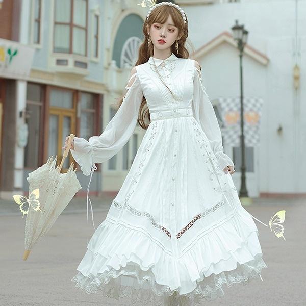 - レディース > ワンピース > angelic pretty 長袖ワンピース 星柄レース star 白 ホワイト ワンピース レディース ロリータ Aライン ロング丈 オープンショルダー