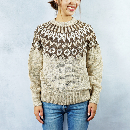 - レディース > ジャケット・アウター > 高級【アルパカ95%】幸せなフワフワ感♪ 2WAY 丸襟 コート ベルアステカ 完売】手紡ぎアルパカ・求心柄ニット(N-390005-ベージュ)・ペルー